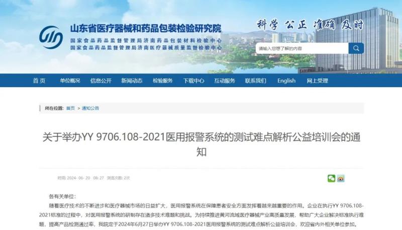 6月20日,山東省醫(yī)療器械和藥品包裝檢驗研究院發(fā)布通知稱,該院定于2024年6月27日舉辦YY 9706.108-2021醫(yī)用報警系統(tǒng)的測試難點解析公益培訓會,此次培訓為線上培訓,省內外相關單位均可報名參加。會議相關事宜具體如下:
