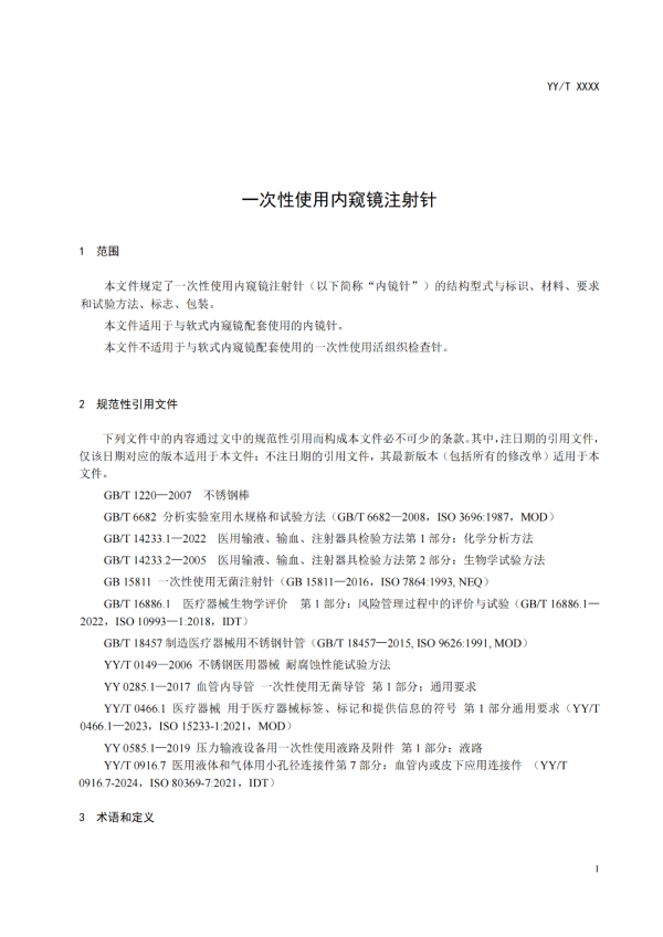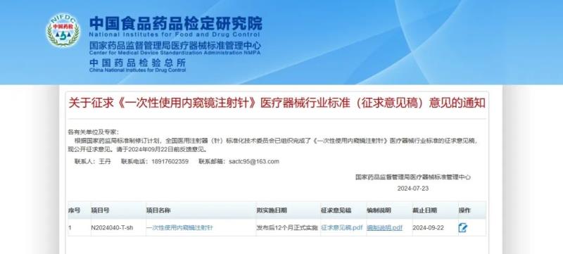 7月23日,國家藥監(jiān)局醫(yī)療器械標(biāo)準(zhǔn)管理中心發(fā)布《一次性使用內(nèi)窺鏡注射針》醫(yī)療器械行業(yè)標(biāo)準(zhǔn)的征求意見稿,并向社會公開征求意見。