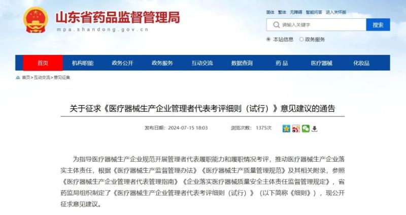 近日,山東省藥監(jiān)局發(fā)布《醫(yī)療器械生產(chǎn)企業(yè)管理者代表考評細(xì)則(試行)》(以下簡稱《細(xì)則》),并向社會(huì)公開征求意見建議。