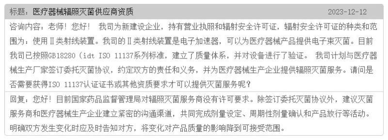 根據(jù)國家藥監(jiān)局食品藥品審核查驗(yàn)中心的答復(fù),目前國家藥品監(jiān)督管理局對輻照滅菌服務(wù)商沒有許可要求。除簽訂委托滅菌協(xié)議外,建議滅菌服務(wù)商和醫(yī)療器械生產(chǎn)企業(yè)建立緊密的溝通渠道,共同完成劑量設(shè)定、周期性劑量確認(rèn)和產(chǎn)品放行等活動(dòng)。明確雙方發(fā)生變化時(shí)應(yīng)及時(shí)告知對方,將變化對產(chǎn)品質(zhì)量的影響降到可接受范圍。