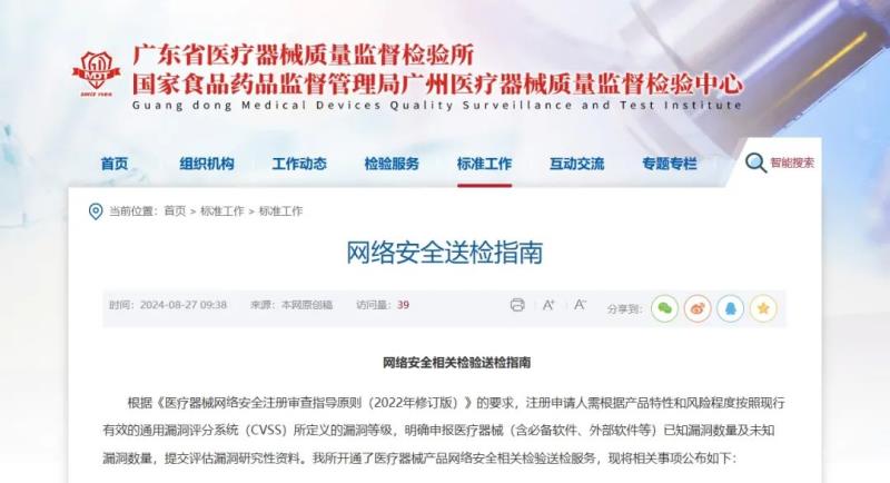 近日,廣東省醫(yī)療器械質(zhì)量監(jiān)督檢驗所就醫(yī)療器械產(chǎn)品網(wǎng)絡安全相關(guān)檢驗送檢事項公布如下: