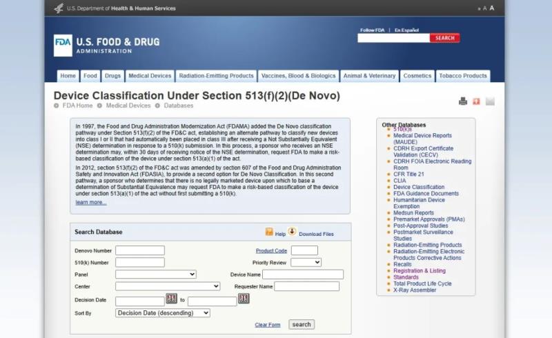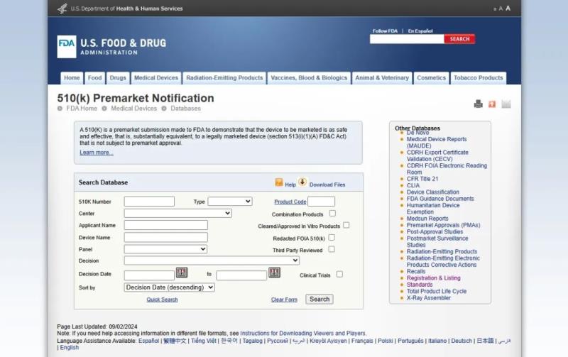 該數(shù)據(jù)庫包含所有通過510(k)路徑在美國(guó)上市的醫(yī)療器械信息。值得注意的是,該網(wǎng)址有一個(gè)最近更新日期,部分剛拿到510(k)號(hào)的產(chǎn)品可能查詢不到,等FDA官網(wǎng)信息更新后即可查詢。