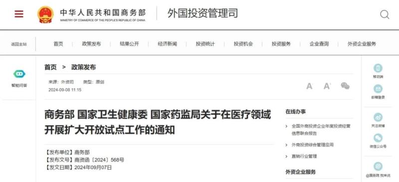 9月8日,商務(wù)部、國家衛(wèi)生健康委、國家藥監(jiān)局聯(lián)合發(fā)布《關(guān)于在醫(yī)療領(lǐng)域開展擴(kuò)大開放試點工作的通知》,以擴(kuò)大開放促進(jìn)我國醫(yī)療相關(guān)領(lǐng)域高質(zhì)量發(fā)展,更好滿足人民群眾醫(yī)療健康需求。以下為該通知具體內(nèi)容: