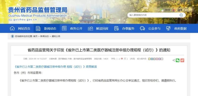 近日,貴州省藥監(jiān)局官網(wǎng)發(fā)布《省外已上市第二類醫(yī)療器械注冊申報辦理規(guī)程(試行)》,具體內(nèi)容如下: