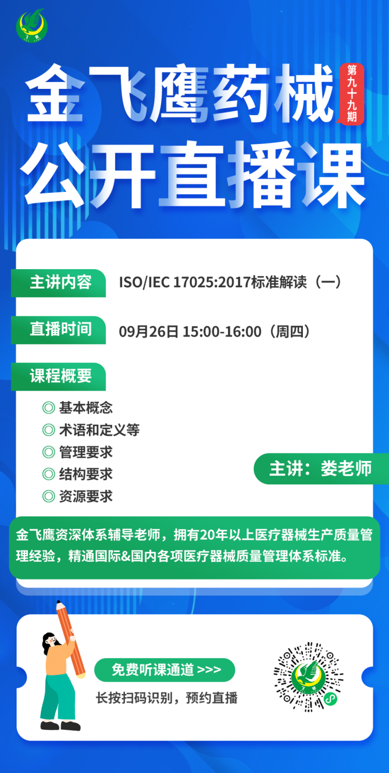 在此基礎上,國家藥監(jiān)局于2021年10月發(fā)布了《醫(yī)療器械注冊自檢管理規(guī)定》(以下簡稱《規(guī)定》),以規(guī)范注冊申請人注冊自檢工作。作為一項重要的注冊自檢參考文件,《規(guī)定》從自檢能力、自檢報告等方面對企業(yè)提出了多項要求,其中“自檢能力要求”中提到,“注冊時開展自檢的,注冊申請人應當具備自檢能力,并將自檢工作納入醫(yī)療器械質(zhì)量管理體系,配備與產(chǎn)品檢驗要求相適應的檢驗設備設施。”但在實際應用時企業(yè)還是會有不少問題,比如到底如何判斷自身是否具備自檢能力?自檢實驗室有什么要求?根據(jù)金飛鷹的日常輔導經(jīng)驗,結合《規(guī)定》要求,企業(yè)自檢實驗室應按照ISO/IEC 17025《測試和校準實驗室能力的通用要求》要求實施,因而此次我們給大家安排了ISO/IEC 17025標準解讀的課題,因內(nèi)容較多,本課題將分為兩期來講,擬開展注冊自檢的醫(yī)械企業(yè)一定不要錯過了~9月26日下午3點,金飛鷹高級項目咨詢師,從事GMP管理相關工作20年,精通國際&國內(nèi)各項醫(yī)療器械質(zhì)量管理體系標準的婁老師,給大家?guī)怼禝SO/IEC 17025:2017標準解讀(一)》,培訓內(nèi)容包括基本概念、術語和定義等、管理要求、結構要求、資源要求,想聽課的朋友記得提前預約哦!