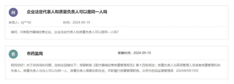 根據(jù)北京市藥監(jiān)局的答復,新版《醫(yī)療器械經(jīng)營質(zhì)量管理規(guī)范》第十四條規(guī)定:質(zhì)量負責人為高層管理人員或者質(zhì)量管理機構(gòu)負責人。質(zhì)量負責人與法人可以為同一人,質(zhì)量負責人需要在職在崗,盡職履行質(zhì)量管理職責。