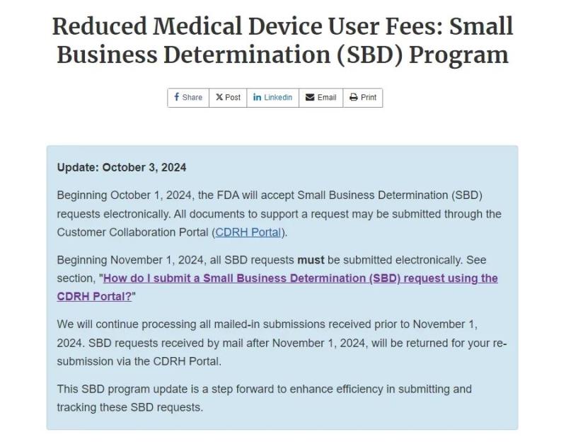 公告提到,從2024年10月1日開始,F(xiàn)DA將接受電子形式的小企業(yè)認(rèn)定(SBD)請求。支持請求的所有文件都可以通過Customer Collaboration Portal(CDRH Portal) 提交。