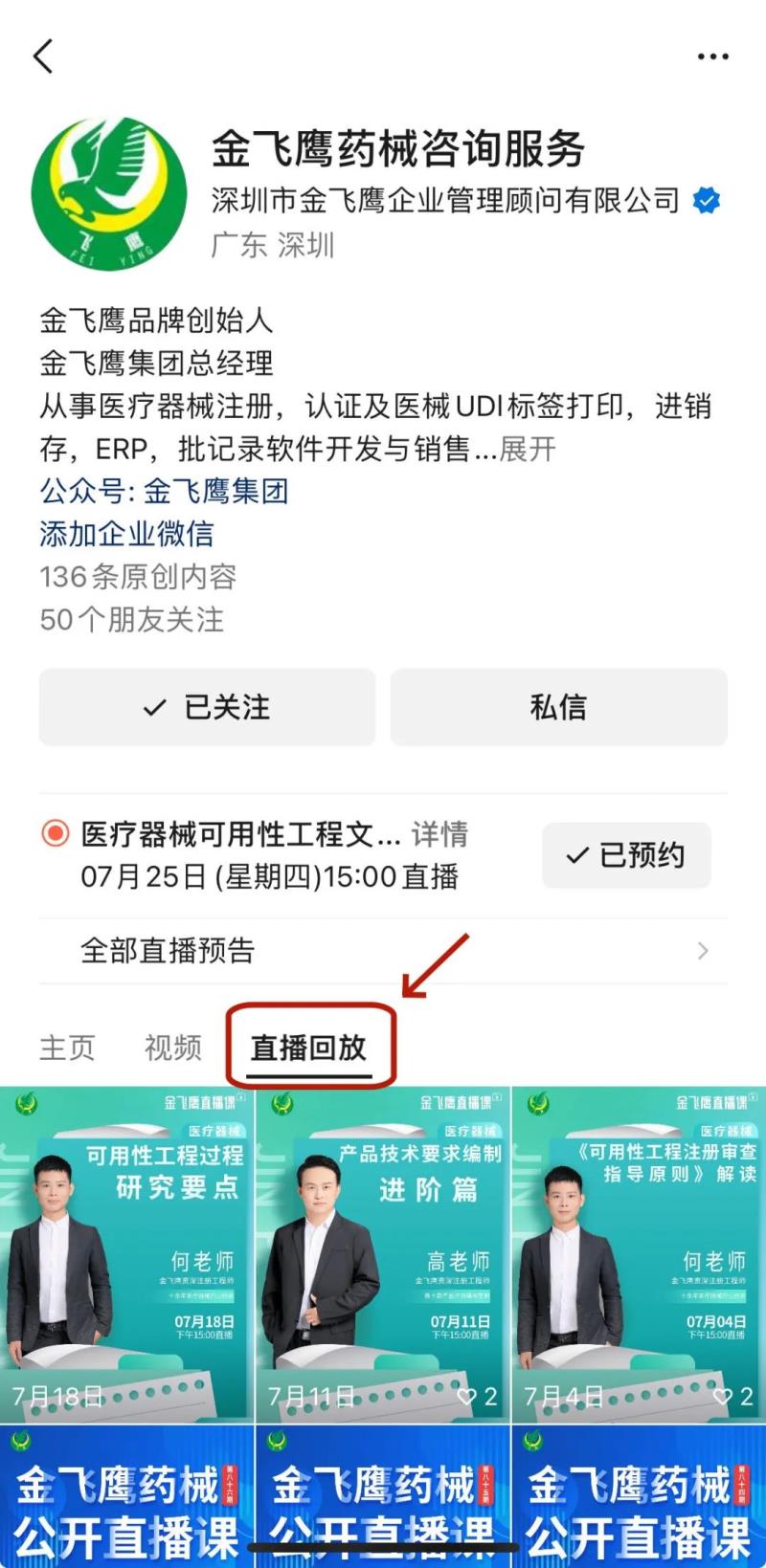 往期直播培訓(xùn)課程支持回放,關(guān)注“金飛鷹藥械咨詢服務(wù)”視頻號并點擊視頻號主頁,即可查看“直播回放”哦~