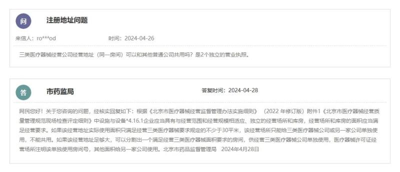 如果該經(jīng)營地址實(shí)際使用面積只滿足經(jīng)營三類醫(yī)療器械要求規(guī)定的不少于30平米,該經(jīng)營場所只能給三類醫(yī)療器械公司或另一家公司單獨(dú)使用,不能共用。如果該經(jīng)營地址足夠大,可以分割出一個(gè)滿足經(jīng)營三類醫(yī)療器械面積要求的房間,供經(jīng)營三類醫(yī)療器械公司單獨(dú)使用,醫(yī)療器械許可證經(jīng)營場所注明該單獨(dú)使用房間號,其他面積給另一家公司使用。