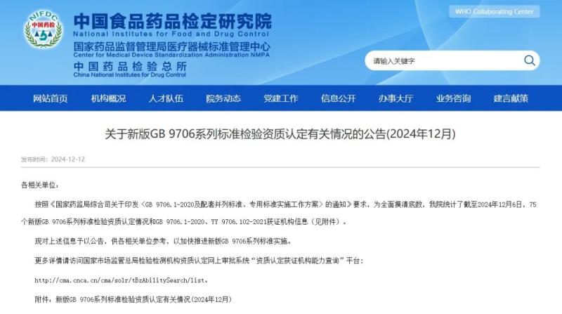 近日,中檢院官網(wǎng)公布了截至2024年12月6日,75個(gè)新版GB 9706系列標(biāo)準(zhǔn)檢驗(yàn)資質(zhì)認(rèn)定情況和GB 9706.1-2020、YY 9706.102-2021獲證機(jī)構(gòu)信息。