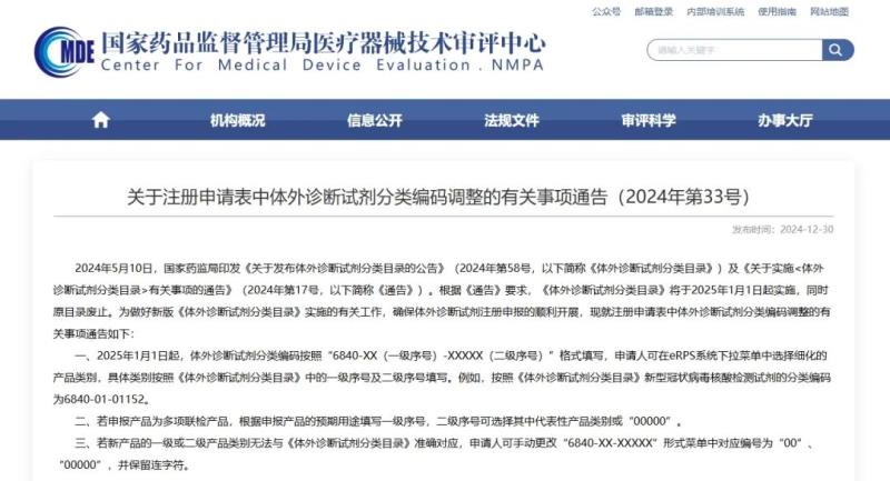 12月30日,國家藥監(jiān)局器審中心發(fā)布通告稱,新版《體外診斷試劑分類目錄》將于2025年1月1日起實施,同時原目錄廢止。為做好新版《體外診斷試劑分類目錄》實施的有關(guān)工作,確保體外診斷試劑注冊申報的順利開展,現(xiàn)就注冊申請表中體外診斷試劑分類編碼調(diào)整的有關(guān)事項通告如下: