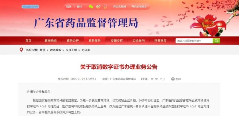 一、廣東省藥監(jiān)行業(yè)企業(yè)用戶免費(fèi)領(lǐng)用的數(shù)字證書(含移動(dòng)數(shù)字證書)通道同步關(guān)閉,已申領(lǐng)的企業(yè)用戶可持續(xù)使用至該數(shù)字證書有效期結(jié)束。 二、原使用數(shù)字證書(CA)辦理業(yè)務(wù)的通道繼續(xù)保留至業(yè)務(wù)辦理完畢,請(qǐng)各相關(guān)企業(yè)和單位在業(yè)務(wù)辦理完結(jié)后盡快完成切換。 三、在使用過(guò)程中有任何疑問(wèn)和建議,請(qǐng)撥打020-37886123、020-37886352進(jìn)行咨詢及答疑。