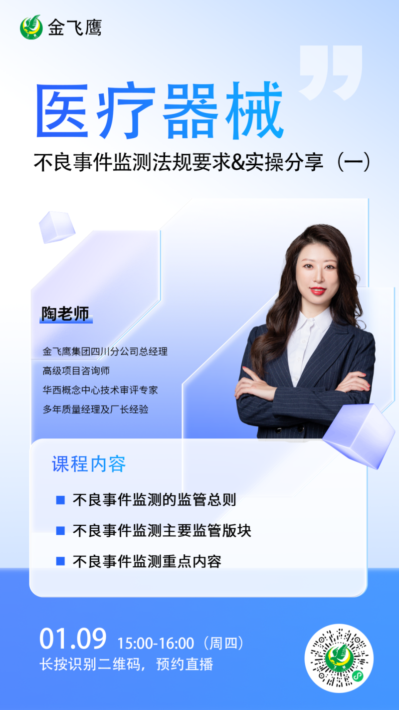 金飛鷹直播培訓(xùn)簡介 金飛鷹直播培訓(xùn),是每周一次的固定培訓(xùn)欄目,優(yōu)選金飛鷹國內(nèi)外資深注冊/項目老師定期為大家講解醫(yī)療器械注冊相關(guān)知識,解答大家在醫(yī)療器械注冊過程中的諸多疑問。 此前我們已為大家?guī)硇掳驷t(yī)療器械生物學(xué)評價標(biāo)準(zhǔn)、新版醫(yī)療器械風(fēng)險管理標(biāo)準(zhǔn)、醫(yī)療器械軟件注冊、醫(yī)療器械質(zhì)量管理體系提升技巧等共計110次線上培訓(xùn)課程,有興趣的可點擊視頻號直播回放進行查看~另外大家也一定很關(guān)注接下來的培訓(xùn)主題,相關(guān)培訓(xùn)預(yù)告我們會陸續(xù)添加至視頻號,請大家持續(xù)關(guān)注哦!