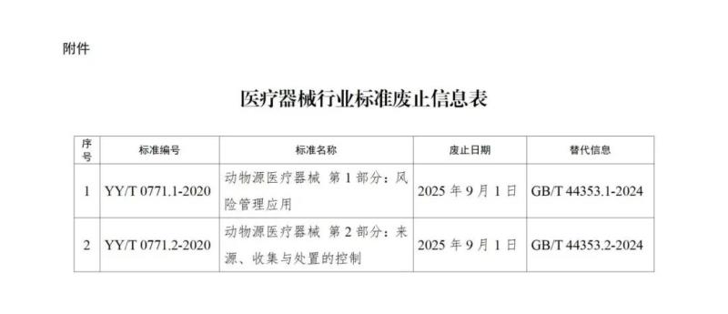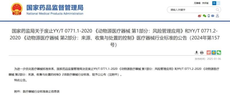 1月6日,國家藥監(jiān)局發(fā)布公告稱,該局決定廢止YY/T 0771.1-2020 《動物源醫(yī)療器械 第1部分:風險管理應用》和YY/T 0771.2-2020 《動物源醫(yī)療器械 第2部分:來源、收集與處置的控制》2項醫(yī)療器械行業(yè)標準,具體明細如下:
