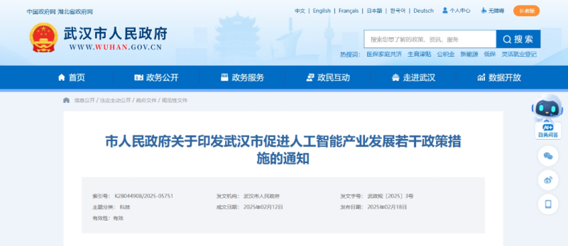 近日,武漢市人民政府發(fā)布《武漢市促進人工智能產(chǎn)業(yè)發(fā)展若干政策措施》(以下簡稱《措施》),以搶抓人工智能發(fā)展機遇,加快建設武漢國家人工智能創(chuàng)新應用先導區(qū),打造國內(nèi)一流的人工智能創(chuàng)新集聚區(qū)和產(chǎn)業(yè)高地。