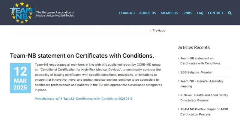 近日,歐盟醫(yī)療器械公告機構協(xié)會(Team-NB)發(fā)布證書附條件批準說明,鼓勵其所有成員持續(xù)考慮簽發(fā)帶有特定條件、條款或限制的證書的可能性。此舉旨在確保創(chuàng)新型、新穎型和罕見病醫(yī)療器械可供醫(yī)療專業(yè)人員和患者使用,同時實施適當?shù)谋O(jiān)督保障措施。根據(jù)歐盟醫(yī)療器械法規(guī)(MDR)2017/745附錄VII第4.8節(jié)的規(guī)定,公告機構(Notified Body)有權在特定條件下簽發(fā)證書。這意味著,在某些情況下,公告機構可以在簽發(fā)證書時附加特定的條件、條款或限制。這種機制不僅適用于MDR,也適用于IVDR。
