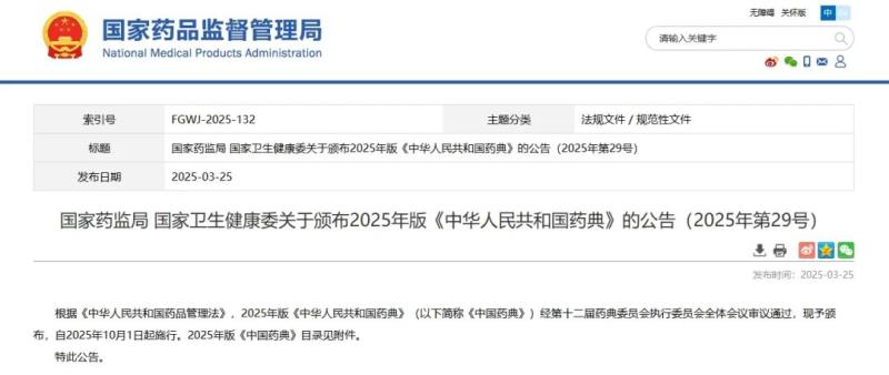 3月25日,國家藥監(jiān)局、國家衛(wèi)生健康委頒布2025年版《中華人民共和國藥典》,并宣布自2025年10月1日起實(shí)施。與此同時(shí),國家藥監(jiān)局對實(shí)施新版《中國藥典》有關(guān)事宜公告如下: