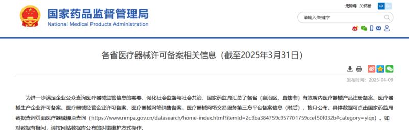 近日,國(guó)家藥監(jiān)局公布了截至2025年3月31日各省有效期內(nèi)醫(yī)療器械產(chǎn)品注冊(cè)備案、醫(yī)療器械生產(chǎn)企業(yè)許可備案等信息,老規(guī)矩,金飛鷹小編對(duì)此稍作編輯,標(biāo)注紅色、綠色、黃色的分別為前三甲。