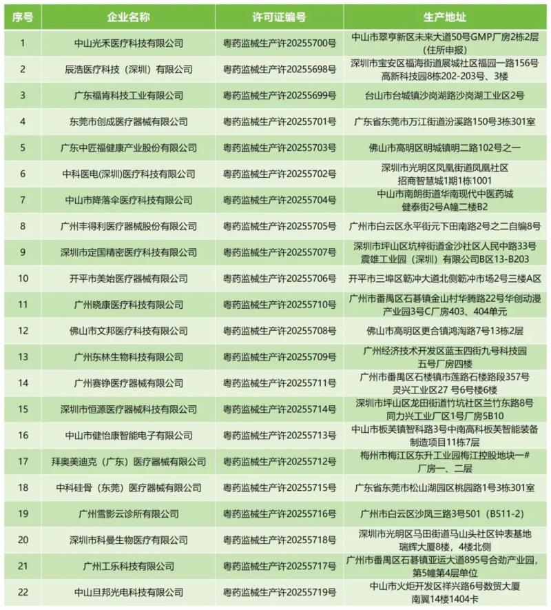 近日,廣東省藥監(jiān)局公布了《2025年3月醫(yī)療器械生產(chǎn)許可證核發(fā)清單》,據(jù)該公開數(shù)據(jù)顯示,該月中山光禾醫(yī)療科技有限公司、辰浩醫(yī)療科技(深圳)有限公司、東莞市創(chuàng)成醫(yī)療器械有限公司等共計22家企業(yè)新拿到了醫(yī)療器械生產(chǎn)許可證,具體明細(xì)如下: