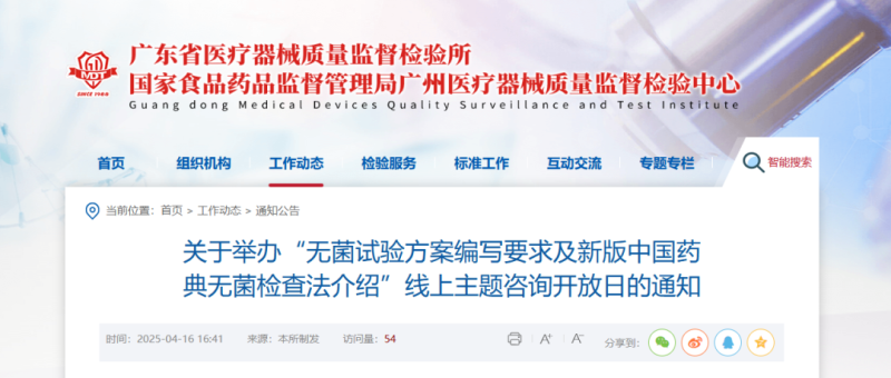 近日,廣東省醫(yī)療器械質(zhì)量監(jiān)督檢驗(yàn)所官網(wǎng)發(fā)布通知,定于4月27日(周日)舉辦“無菌試驗(yàn)方案編寫要求及新版中國藥典無菌檢查法介紹”線上主題咨詢開放日活動(dòng),具體時(shí)間及參會(huì)方式如下: