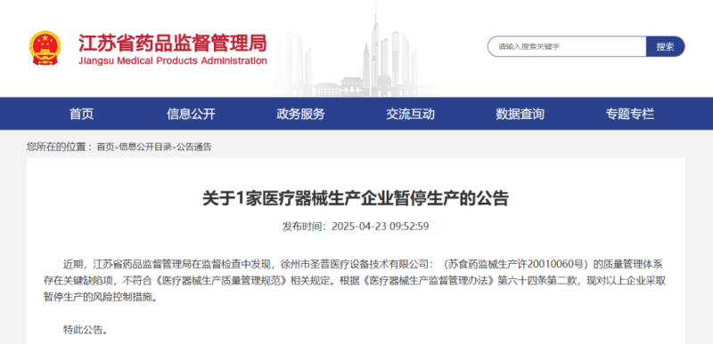 近日,江蘇省藥監(jiān)局發(fā)布公告稱,該局在監(jiān)督檢查中發(fā)現(xiàn),徐州市**醫(yī)療設(shè)備技術(shù)有限公司(蘇食藥監(jiān)械生產(chǎn)許20010060號(hào))的質(zhì)量管理體系存在關(guān)鍵缺陷項(xiàng),不符合《醫(yī)療器械生產(chǎn)質(zhì)量管理規(guī)范》相關(guān)規(guī)定。根據(jù)《醫(yī)療器械生產(chǎn)監(jiān)督管理辦法》第六十四條第二款,現(xiàn)對(duì)以上企業(yè)采取暫停生產(chǎn)的風(fēng)險(xiǎn)控制措施。
