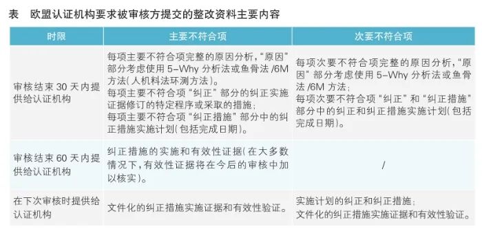 針對審核發(fā)現(xiàn)的不符合項(xiàng),歐盟認(rèn)證機(jī)構(gòu)要求被審核方提交原因分析、糾正措施等整改資料(詳見表)。