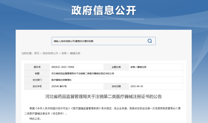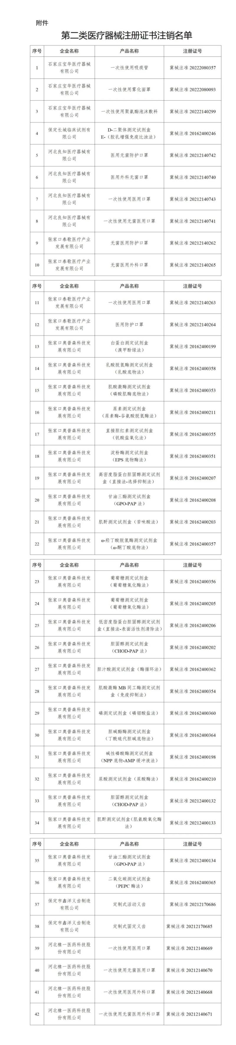 近日,河北省藥監(jiān)局發(fā)布公告稱,根據(jù)《中華人民共和國行政許可法》《醫(yī)療器械監(jiān)督管理?xiàng)l例》有關(guān)規(guī)定,依企業(yè)申請,該局依法注銷了42個(gè)第二類醫(yī)療器械注冊證書,其中有12款產(chǎn)品為醫(yī)用口罩,還有一次性使用吸痰管、一次性使用霧化面罩、一次性使用聚氨酯泡沫敷料、定制式活動義齒等,具體明細(xì)如下: