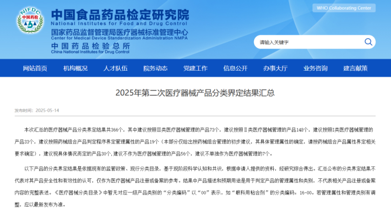 5月14日,國(guó)家藥監(jiān)局醫(yī)療器械標(biāo)準(zhǔn)管理中心發(fā)布《2025年第二次醫(yī)療器械產(chǎn)品分類界定結(jié)果匯總》,本次共匯總了366個(gè)醫(yī)療器械產(chǎn)品分類界定結(jié)果,其中建議按照Ⅲ類醫(yī)療器械管理的產(chǎn)品73個(gè),建議按照Ⅱ類醫(yī)療器械管理的產(chǎn)品148個(gè),建議按照Ⅰ類醫(yī)療器械管理的產(chǎn)品33個(gè),建議按照藥械組合產(chǎn)品判定程序界定管理屬性的產(chǎn)品19個(gè),建議視具體情況而定的產(chǎn)品30個(gè),建議不作為醫(yī)療器械管理的產(chǎn)品56個(gè),建議不單獨(dú)作為醫(yī)療器械管理的7個(gè)。
