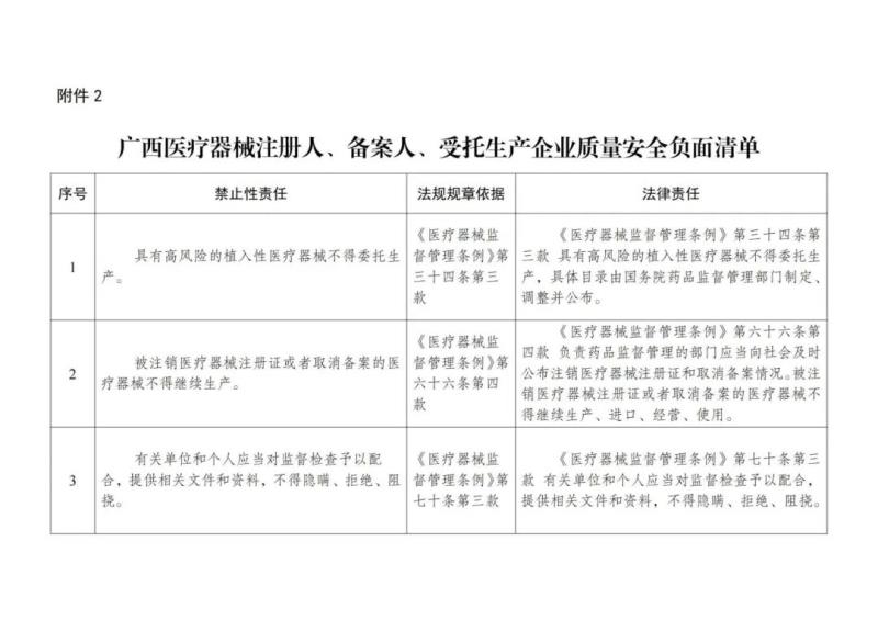 我們將其中《廣西醫(yī)療器械注冊人、備案人、受托生產(chǎn)企業(yè)質(zhì)量安全負面清單》以圖片形式轉載如下: