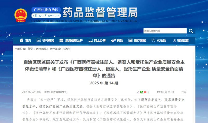 近日,廣西壯族自治區(qū)藥監(jiān)局發(fā)布《廣西醫(yī)療器械注冊人、備案人和受托生產(chǎn)企業(yè)質(zhì)量安全主體責任清單》和《廣西醫(yī)療器械注冊人、備案人、受托生產(chǎn)企業(yè)質(zhì)量安全負面清單》,以強化醫(yī)療器械行政相對人質(zhì)量安全主體責任,切實履行法定義務,提高質(zhì)量安全管理水平,推動醫(yī)療器械產(chǎn)業(yè)高質(zhì)量發(fā)展。