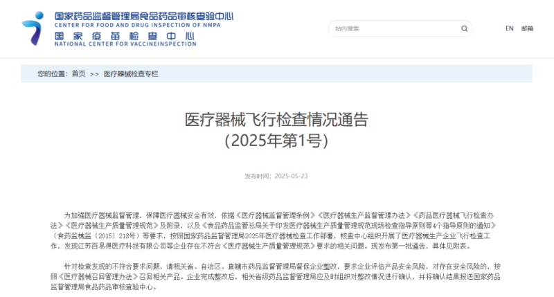 近日,國家藥監(jiān)局食品藥品審核查驗中心(以下簡稱“核查中心”)發(fā)布《醫(yī)療器械飛行檢查情況通告(2025年第1號)》,其中提到,核查中心組織開展了醫(yī)療器械生產(chǎn)企業(yè)飛行檢查工作,發(fā)現(xiàn)江蘇百易得醫(yī)療科技有限公司、朔崛(江蘇)醫(yī)療科技有限公司、江西洪達醫(yī)療器械集團有限公司等18家企業(yè)存在不符合《醫(yī)療器械生產(chǎn)質(zhì)量管理規(guī)范》要求的相關(guān)問題,生產(chǎn)品種包括不可吸收帶線錨釘、血液透析濃縮液、髖關(guān)節(jié)假體、醫(yī)用膠原填充劑、注射用交聯(lián)透明質(zhì)酸鈉凝膠等。