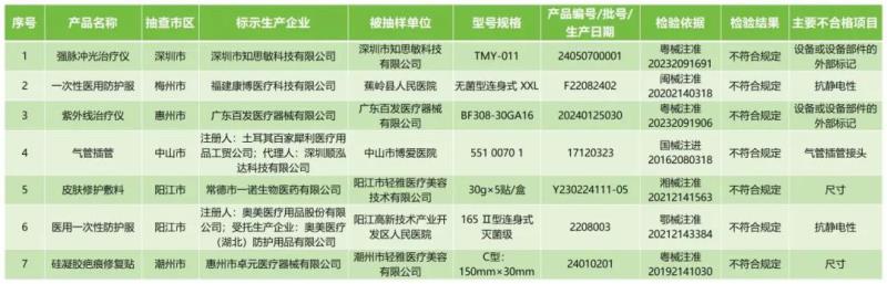 近日,廣東省藥監(jiān)局發(fā)布《關于醫(yī)療器械抽查檢驗信息的通告(2025年第1期,總第91期)》,我們通過查看附件發(fā)現(xiàn),本次共抽檢了541批次產品,其中有7批次產品不符合規(guī)定,包括強脈沖光治療儀、一次性醫(yī)用防護服、紫外線治療儀等,不符合規(guī)定產品具體明細如下: