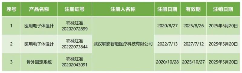 6月11日,湖北省藥監(jiān)局發(fā)布三則《醫(yī)療器械注冊(cè)證》注銷(xiāo)公告,我們通過(guò)查看公告內(nèi)容發(fā)現(xiàn),被注銷(xiāo)的注冊(cè)證均來(lái)自同一家公司——武漢聯(lián)影智融醫(yī)療科技有限公司,產(chǎn)品包括醫(yī)用電子體溫計(jì)及骨外固定系統(tǒng),以下為具體明細(xì):