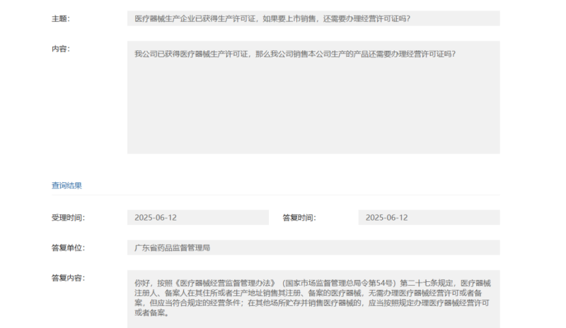 根據(jù)廣東省藥監(jiān)局的答復(fù),按照《醫(yī)療器械經(jīng)營(yíng)監(jiān)督管理辦法》(國(guó)家市場(chǎng)監(jiān)督管理總局令第54號(hào))第二十七條規(guī)定,醫(yī)療器械注冊(cè)人、備案人在其住所或者生產(chǎn)地址銷售其注冊(cè)、備案的醫(yī)療器械,無需辦理醫(yī)療器械經(jīng)營(yíng)許可或者備案,但應(yīng)當(dāng)符合規(guī)定的經(jīng)營(yíng)條件;在其他場(chǎng)所貯存并銷售醫(yī)療器械的,應(yīng)當(dāng)按照規(guī)定辦理醫(yī)療器械經(jīng)營(yíng)許可或者備案。