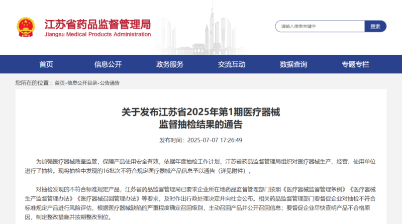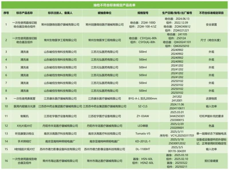 近日,江蘇省藥監(jiān)局發(fā)布《江蘇省2025年第1期醫(yī)療器械監(jiān)督抽檢結(jié)果的通告》,共通告了一次性使用直線切割吻合器及吻合組件、一次性使用鼻氧管、制氧機、聽覺康復(fù)訓(xùn)練儀等16批次不符合規(guī)定醫(yī)療器械產(chǎn)品,具體明細(xì)如下: