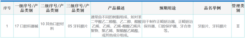 我們通過查看本次獲證產品的“結構及組成”可以看到,此類產品“由具有醫(yī)療器械注冊證的牙科膜片經壓制成型后打磨、拋光而成?!币虼耍?span textstyle="" style="-webkit-tap-highlight-color: transparent; margin: 0px; padding: 0px; outline: 0px; max-width: 100%; box-sizing: border-box !important; overflow-wrap: break-word !important; font-weight: bold;">牙膠片/牙科膜片是正畸矯治器最為關鍵的一項原材料,可以外購,也可以企業(yè)自己生產,但前提是要有注冊證(同樣是Ⅱ類產品,分類編碼17-10-05)。