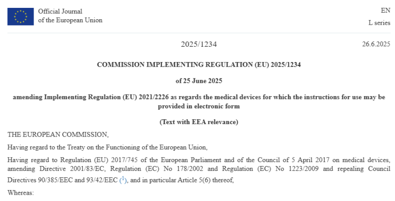 上月底,歐盟委員會發(fā)布COMMISSION IMPLEMENTING REGULATION (EU) 2025/1234,旨在對 2021 年出臺的醫(yī)療設(shè)備電子說明書相關(guān)條例Regulation(EU)2021/2226進(jìn)行重要修訂,核心變化圍繞電子說明書的適用范圍與實(shí)施細(xì)節(jié)。