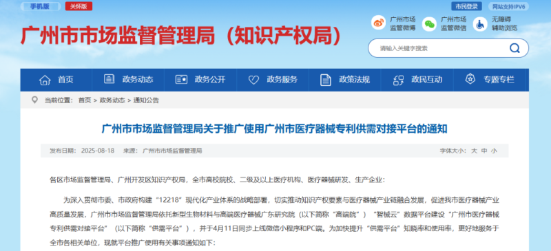 8月18日,廣州市市場(chǎng)監(jiān)督管理局發(fā)布《關(guān)于推廣使用廣州市醫(yī)療器械專利供需對(duì)接平臺(tái)的通知》(以下簡(jiǎn)稱《通知》),《通知》提到,該局依托新型生物材料與高端醫(yī)療器械廣東研究院(以下簡(jiǎn)稱“高端院”)“智械云”數(shù)據(jù)平臺(tái)建設(shè)“廣州市醫(yī)療器械專利供需對(duì)接平臺(tái)”(以下簡(jiǎn)稱“供需平臺(tái)”),并于4月11日同步上線微信小程序和PC端。現(xiàn)就平臺(tái)推廣使用有關(guān)事項(xiàng)通知如下: