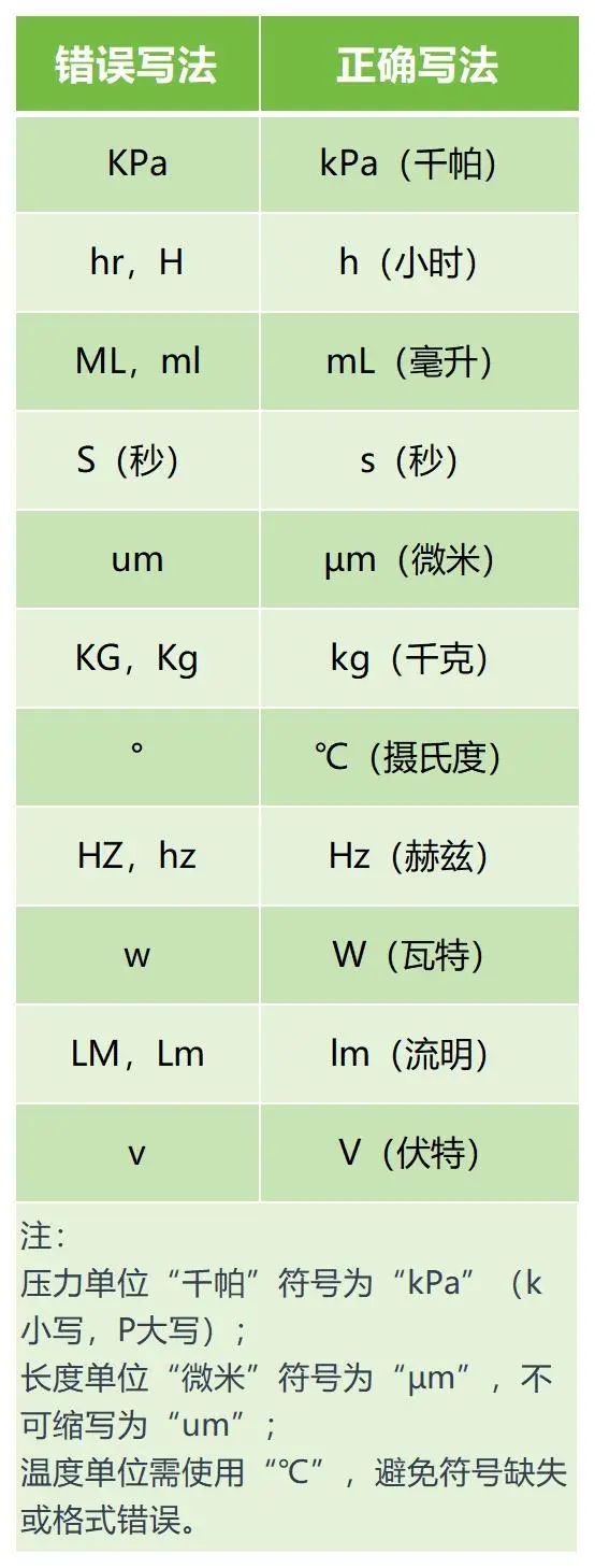 國際標(biāo)準(zhǔn)單位(SI單位)的書寫需嚴(yán)格遵循規(guī)范,避免因符號(hào)、大小寫錯(cuò)誤導(dǎo)致技術(shù)文件失效。部分示例如下: