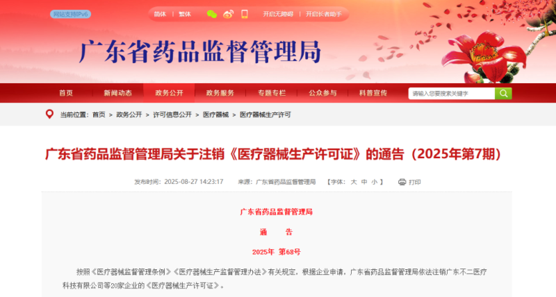 近日,廣東藥監(jiān)局發(fā)布通告稱,按照《醫(yī)療器械監(jiān)督管理條例》《醫(yī)療器械生產(chǎn)監(jiān)督管理辦法》有關(guān)規(guī)定,根據(jù)企業(yè)申請,該局已于依法注銷深圳市思肯三維科技發(fā)展有限公司、廣東小豬班納醫(yī)療生物科技有限公司、廣東徠康醫(yī)療科技有限公司等20家企業(yè)的《醫(yī)療器械生產(chǎn)許可證》,具體明細(xì)如下: